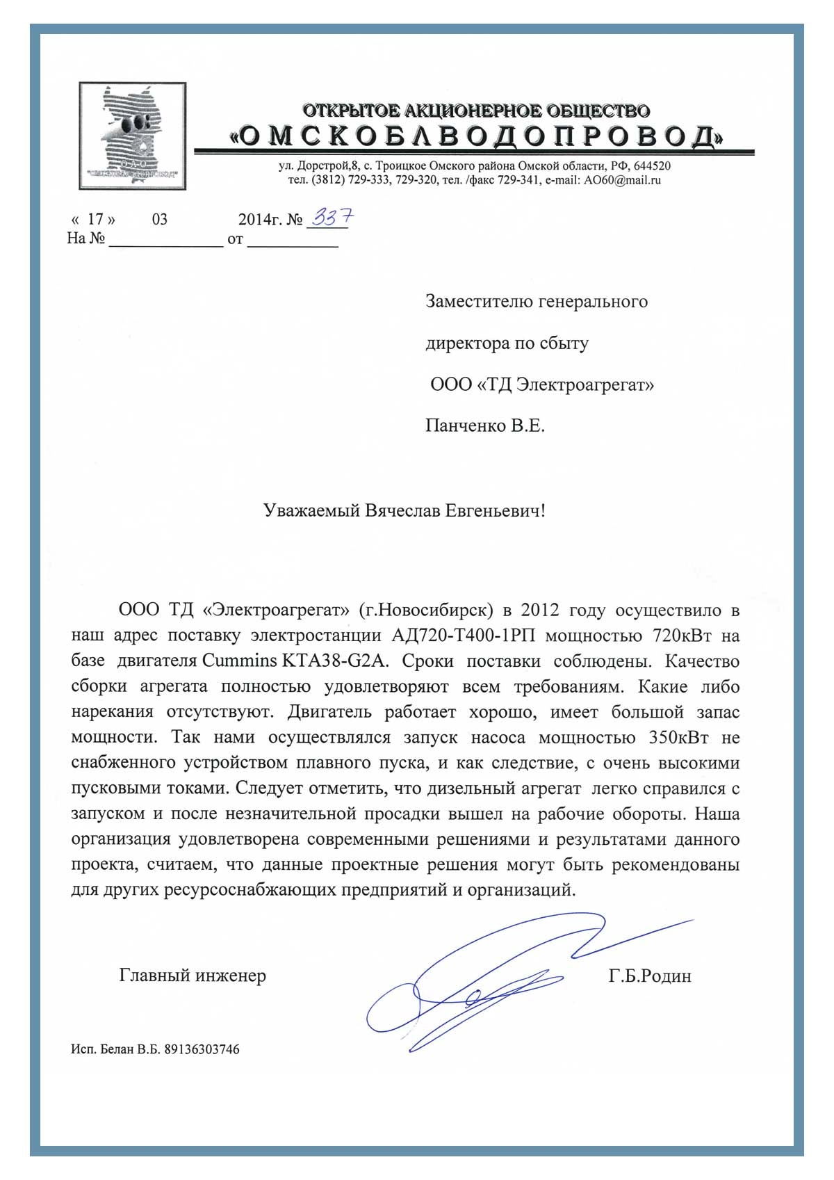 Завод "ТД Электроагрегат" (г.Новосибирск) в 2012 году осуществило в наш адрес поставку электростанции АД720-Т400-1РП мощностью 720 кВт на базе двигателя Cummins KTA38-G2A. Сроки поставки соблюдены. Качество сборки агрегата полностью удовлетворяет всем требованиям. Какие-либо нарекания отсутствуют. Двигатель работает хорошо, имеет большой запас мощности. Так нами осуществлялся запуск насоса мощностью 350 кВт не снабженного устройством плавного пуска и, как следствие, с очень высокими пусковыми токами.
